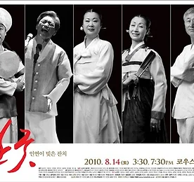 15년 간 일본 나고야의 ‘놀이판’을 방문하여 한국의 전통예술을 가르쳐 온 한국의 명인들이 함께 으로 눈앞에서 재현된다. 채상소고춤의 명인 김운태, 통영굿의 지킴이 정영만, 춤추는 농사꾼 이윤석, 영남춤의 편력자 박경랑, 우리시대 최고의 가객 장사익, 더 이상 설명이 필요 없는 최고의 꾼들이 나서는 것이다. 또한 도살풀이춤의 이정희가 이나가키 마사토를 춤으로 해원하고, KOUS 예술감독 진옥섭의 훈훈한 연출이 가미되어, 광복절 기념을 넘어서서 자이니치(在日) 민족문화의 미래진행형을 만들어 내는, 아름다운 잔치를 빚어낼 것이다. 일시 2010.8.14(토) 오후 3시 30분, 7시 30분 (2회) 장소 코우스(KOUS)-한국문화의 집 기획연출 진옥섭 출연 장사익, 이윤석, 이정희, 변인자, 김운태, 박경랑..